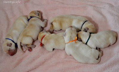 Lady's puppies are 3 weeks old, they can hear, see, and we can have their attention for some seconds, they are walking on their feet... we've made individual photos of them: